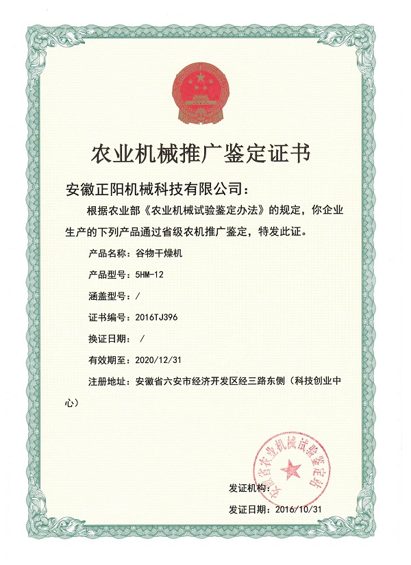 農業機械推廣鑒定證書