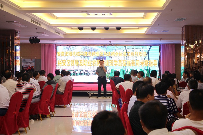 913日下午,裕安區(qū)職業(yè)農(nóng)民培訓(xùn)班一行人蒞臨我公司考察指導(dǎo),此次培訓(xùn)班由200多名種植大戶組成,場面十分熱鬧,公司張為法總經(jīng)理、許為青副總經(jīng)理、總經(jīng)理助理胡家冀、銷售部部長張杰等參與了此次接待活動,張為法總經(jīng)理代表安徽正陽機械科技有限公司表達了對于他們此次來訪的熱烈歡迎。